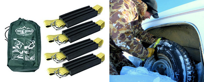 The Trac-Grabber Tire Traction Aid is designed to provide a simple solution to free a vehicle that's stuck in mud, sand, snow, or adverse terrain. To get unstuck, just strap the device over the tire of each drive wheel and slowly apply power. As you do, it will lift and move the vehicle forward until reaching stable ground. (Models available for cars, trucks, and off-roads vehicles.)