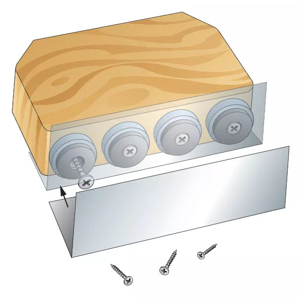 With this Homemade Metal-Pickup Tool, David Wilhelm (Cedar Grove, IN) can more easily retrieve nails, screws, nuts, or any other small metal objects, whether on his shop floor or work bench. The devise is simply a 6-inch-long piece of 2 x 4 into which are screwed (on the 6-inch edge) a line of four strong round magnets that have holes in the middle. Covering the magnets is a piece of aluminum flashing creased to fold under the 2 x 4. To operate, Wilhelm holds the flashing in place to pick up the metal objects. Once the bottom is full, he pulls the flashing away from the magnets and the pieces drop off, which is easier and safer than scraping them from an unprotected magnet.