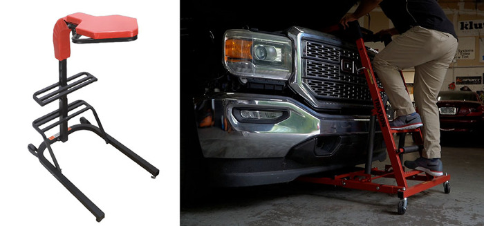 An Over-the-Engine Topside Creeper, the top portion of which adjusts up to 65 inches, fits over the engine of most autos and pickups. (For bigger trucks, it may need to be on a platform.) The steel-tube-frame device usually includes four caster wheels, wide access steps, and a cushioned chest pad. It's load-rated up to 400 pounds.