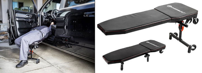 An Under-the-Dash Creeper is designed for accessing hard-to-reach areas beneath a vehicle's dashboard (or steering wheel) while providing a relatively comfortable work position over extended periods. It consists of a cushioned lay-on board (about 40 inches long, 15-20 inches wide), at one end of which is a height-adjustable, two-legged steel frame fitted with lock-brake or removable caster wheels. Some models are dual functional, serving as a floor creeper when not used for under-dash work. All are frame-foldable for storage and transport.