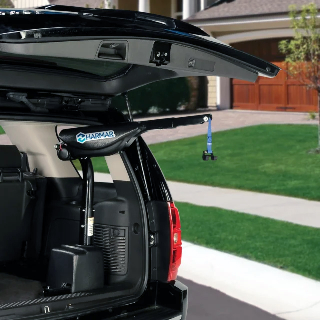 Harmar Wheelchair Hoist Lifts, housed in the cargo area of an SUV, pickup truck, or full-size van, are designed to allow one to load a manual wheelchair, power wheelchair, or scooter weighing up to 450 pounds. These lifts are designed so as to not (1) obstruct the vehicle's backup camera view, (2) add any extra inches to the rear, or (3) require a platform under the chair that would otherwise take up cargo space. They are operated via hand-held remote or optional wireless remote. (Numerous models are available, depending primarily on vehicle type and chair weight).